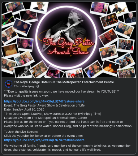 Music greats and Hall of Fame legends have donated valuable awards, records, and artifacts, in recognition of the outstanding quality music venue that the Royal George signifies in the Winnipeg music scene.